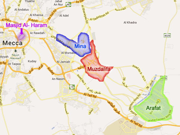 The distance from Makkah to Madeenah is about 450 km. Mina, Muzdalifah and ‘Arafah are all located inside [the city of] Makkah, but whilst the first two are within the Sacred Precincts, ‘Arafah is outside. The distance between ‘Arafah, Mina and Muzdalifah, and the Sacred Precincts is a few kilometers, with the furthest being ‘Arafah, followed by Muzdalifah and then Mina. In other words, Mina is located about 7 km from the Sacred Mosque(Masjid E Haram ), Muzdalifah at about 10 km and ‘Arafaat is nearly 20 km away. As for the distance between ‘Arafaat and Muzdalifah, it is approximately 7 km.[2]